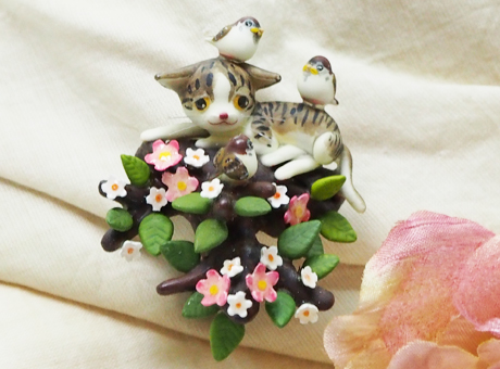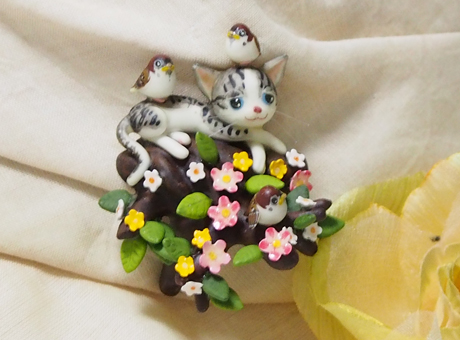 ちょっと半目で眠たそうな猫ちゃんと、まだくちばしの黄色い子スズメ3羽のブローチです。