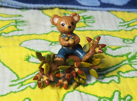 どんぐりがたくさん付いた小枝に座ってる子グマのぬいぐるみって仕様です。