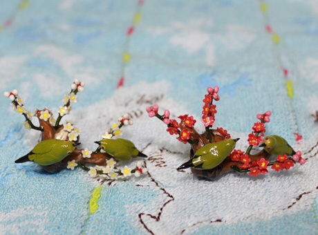 写真のメジロちゃん作品はCreemaさんでの個人オーダーで作った紅白梅のブローチ作品です。