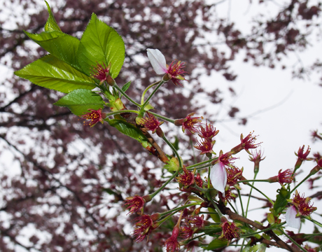 新芽の葉の緑色と花びらが散って残った花芯の赤い色がとても綺麗だと思います。