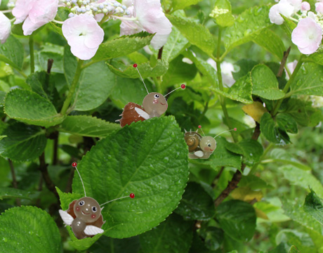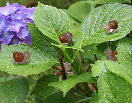 近所のアジサイの花や葉っぱを撮影しようと傘をさしながらファインダーを覗いていたら葉っぱのあっちこったから「クリオネツムリ」が出て来て楽しそうに遊んでいました。