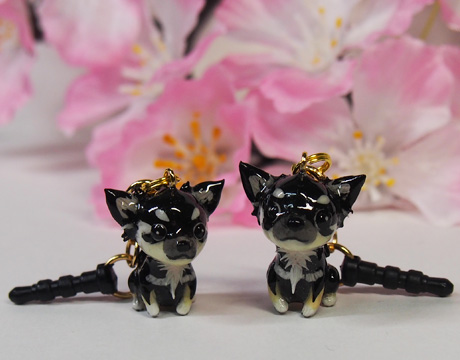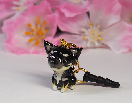 ブラックタンのチワワちゃんのイヤホンジャック・マスコットです。