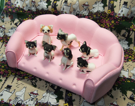 試しにまだ全身の毛付け作業がこれからの7チワワちゃんを並べてみました。