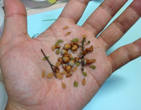 さで、これで全て小道具も揃ったので、落ち葉やドングリをバランス良くレイアウトして作品を完成させたいと思います。