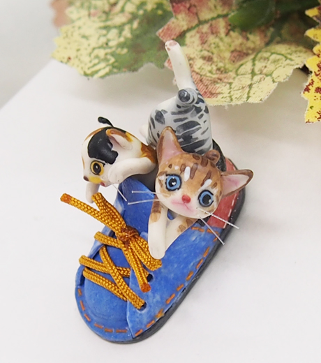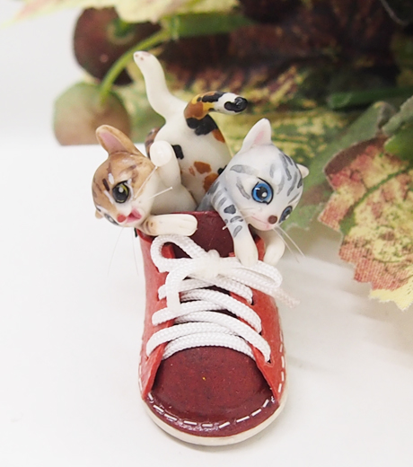 小さな靴にギュウギュウ詰めに入った仔猫ちゃんたちのブローチ作品です。