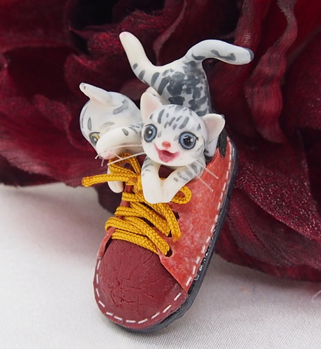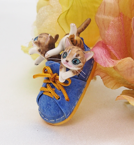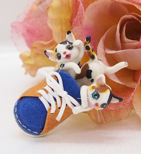 小さな靴にギュウギュウ詰めで入った仔猫のブローチ3作品が完成しました。