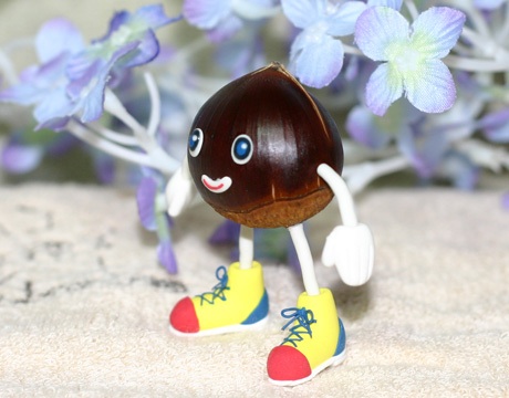 写真のキャラクターは近所で拾った本物の栗の実です。
