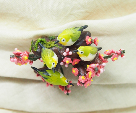 紅梅、白梅で遊ぶメジロのブローチ作品が完成しました。