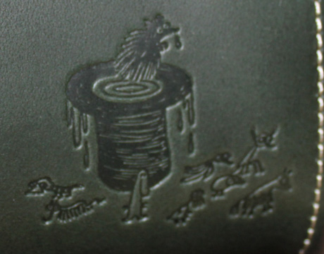 型押しのイラストは飛行鬼(ひこうおに)の帽子なのですが・・・・ムーミンの一番最初のお話に出てくるアリジゴクが飛行鬼の魔法のシルクハットに入ってハリネズミに変えられてしまう場面のイラストです。
