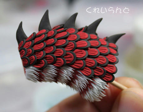 うろこは少し大きめの黒粘土で一枚作り、その上にエンジ色のうろこを重ねて3本のスジをカッターの刃で付けています。